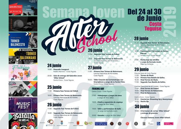 Torneos de fútbol, balonmano, baloncesto, certamen de cortos, noche bajo las estrellas, talles de sensaciones, de motivación, recital de poesía, son algunas de las propuestas de ocio de esta Semana Joven, cuyo plato fuerte llegará el sábado 29 con el Torneo de Skate y la Batalla de Gallos en el Skate de Costa Teguise, a cargo de la ONG Full RapZarote, y la posterior fiesta de cierre, After Schook Music Fest, en la que participarán dos grupos juveniles de la isla y seis DJs amateurs.