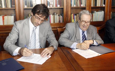 El presidente del Cabildo, Pedro San Ginés, y el presidente de la Sociedad para la Promoción Cultural de Canarias en Europa, Jerónimo Saavedra, han rubricado este viernes al mediodía un convenio que permitirá la presencia de la mencionada Sociedad en la isla de Lanzarote, teniendo como sede la ciudad de Arrecife.
