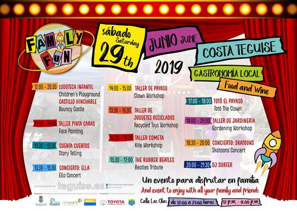 Family Fun se celebrará este sábado 29 de junio, desde las 12 hasta las 21 horas, en la rotonda de la Plaza Tenerife (calle Las Olas de Costa Teguise), al inicio de la Avenida de Las Cucharas. Se adjunta programa.