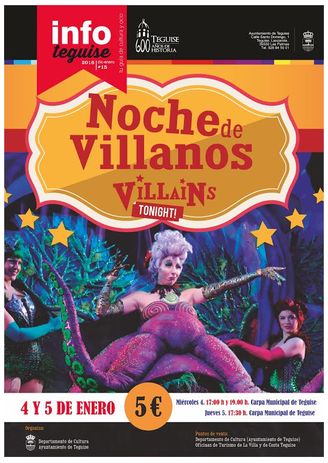 El Capitán Garfio, la madrastra de Blancanieves, Maléfica, Cruella de Vil, Pena, Pánico y Hades, entre otros malvados de la factoría Disney, asaltarán Teguise este miércoles por la noche con doble sesión del musical infantil “Noche de villanos”, la nueva obra de producción cien por cien lanzaroteña que promueve la Concejalía de Cultura y Festejos del Ayuntamiento de Teguise, coordinada por Olivia Duque, y que se estrenará este 4 de enero en doble sesión, repitiendo este jueves en un único pase previo a la Cabalgata de SSMM Los Reyes Magos de Oriente.