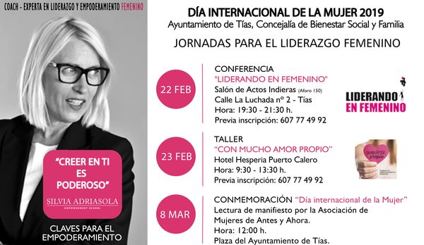 El Ayuntamiento de Tías está organizando, dentro de los actos por el Día Internacional de la Mujer, unas jornadas de liderazgo femenino. El Área de Bienestar Social y la Familia, bajo la dirección de la concejal Aroa Pérez, ha promovido estas jornadas que se desarrollarán los días 22 y 23 de febrero, y 8 de marzo próximo, día de la celebración de la jornada dedicada a la sensibilización sobre la mujer trabajadora, según ha informado este jueves la institución en nota de prensa.