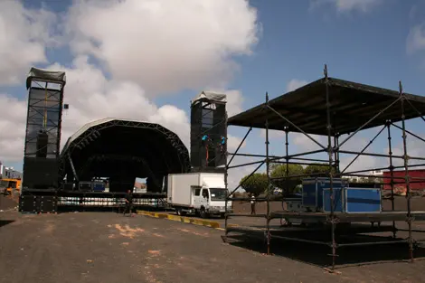 Se ultiman los detalles en Playa Bastián de Costa Teguise para acoger este fin de semana los conciertos del Festival “Costa de Músicas”. Los organizadores mantienen las previsiones de asistencia -unas 15.000 personas- a una cita que este año llega cargada de expectativas. Ya está instalado el escenario principal en la explanada situada junto al paseo marítimo (en la imagen).