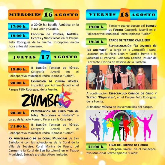 19:30 h.: Representación de “LA LEYENDA DE ISLA QUEMADA” a cargo de la Compañía Teatral Losótroh en la Plaza León y Castillo frente a la Sociedad El Porvenir. Colabora Cabildo Insular de Lanzarote, oficina de Reserva de la Biosfera. A continuación espectáculo cómico de Circo y Teatro “DISPARATES” en el Parque Félix Rodríguez de la Fuente. Al finalizar música en el parque zona de ventorrillos.