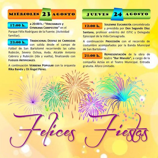 A las 12:00 horas tendrá lugar la Solemne Eucaristía concelebrada y presidida por Don Segundo Díaz Santana, profesor emérito del ISTIC y Delegado Episcopal de la Vida Consagrada. A continuación Procesión con el recorrido de costumbre acompañados por la Banda Municipal de San Bartolomé. A las 21:00 horas, representación de la obra de Teatro “Bar Manolo” a cargo de la compañía Actúa en el Teatro Municipal. Entrada gratuita. Aforo Limitado.