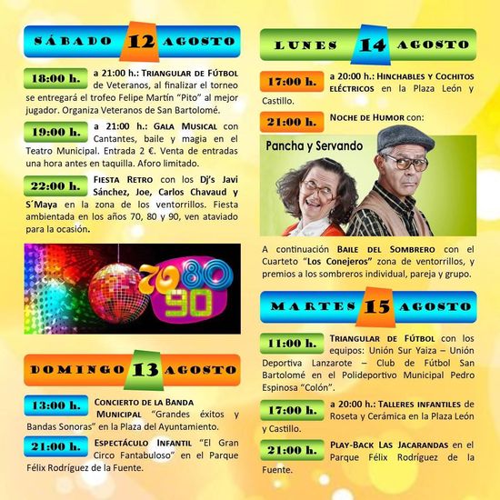 23:00 h.: Tradicional desfile de Carrozas con salida desde el campo de Fútbol de San Bartolomé recorriendo las calles Rubicón, Severo Ochoa, Avda. Alcalde Antonio Cabrera y Rubicón (Ida y vuelta), finalizando con Fuegos Artificiales. A continuación Verbena Popular con la orquesta Rika Banda y D.J Ángel Pérez.