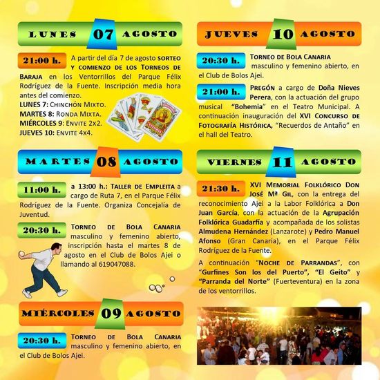 Ya el viernes 11 de agosto, a las 21:30 horas, tendrá lugar otro de los actos importantes de estas fiestas el XVI Memorial Folklórico Don José Mª Gil, con la entrega del Reconocimiento Ajei a la Labor Folklórica a Don Juan García y la actuacion de la Agrupación Folklórica Guadarfía, acompañada de los solistas Pedro Manuel Afonso (Gran Canaria) y Almudena Hernández (Lanzarote) en el Parque Félix Rodríguez de la Fuente. A continuación se celebrará la tradicional “Noche de Parrandas” con Gurfines Son los del Puerto, El Geito y Parranda del Norte (Fuerteventura) en los ventorrillos del Parque Félix Rodríguez de la Fuente.