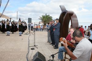 La escultura instalada junto a la iglesia de La Candelaria de Tías, patrona del municipio isleño y realizada por los artistas asturianos Mercedes Cano y Antonio Sobrino, se convirtió en fiel testigo del hermanamiento. La obra, según la autora, está basada en tres elementos diversos que se unen y se complementan para formar un espacio ideal. Precisamente el objetivo que persiguen estas comunidades. “Nuestra intención fue partir de tres caminos paralelos que en su recorrido terminan por confluir en uno solo” detalló la artista, al tiempo que agradeció “la oportunidad” brindada por los responsables del hermanamiento. “Es muy importante para nosotros y para nuestro trabajo poder tener una obra en cada uno de los tres municipios y agradezco sinceramente el apoyo que nos dan”, añadió Cano. El acto de inauguración de la pieza finalizó con la entrega por parte de los asturianos de un presente, una carpeta de grabados en seligrafias de cuatro estampas asturianas, con las que quisieron agradecer la hospitalidad brindada por sus “hermanos” canarios.