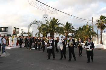 A continuación, se llevó a cabo una procesión acompañada por la Banda Municipal. En este acto se contó con la presencia de diversas autoridades, como el concejal de Urbanismo del Ayuntamiento de Yaiza, Leonardo Rodríguez, el consejero del Cabildo por Coalición Canaria, Manuel Fajardo Feo, la alcaldesa de Yaiza, Gladis Acuña, el vicepresidente primero de la Primera Institución, Fabián Martín, y el alcalde de Teguise, José Dimas Martín, entre muchos otros.