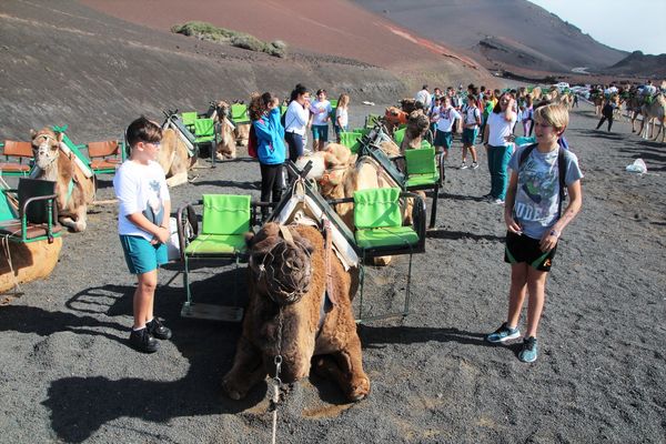 La Semana Cultural del Camello inició este martes con la visita de escolares del CEIP Yaiza y del CEIP Uga al echadero de camellos del Parque Nacional de Timanfaya. Escolares y profesores acompañantes disfrutaron de un paseo a lomo de animal.