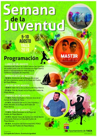 Seguidamente, el lunes 5, arranca la Semana de la Juventud, en la que se sucederán múltiples actividades culturales orientadas a los jóvenes, que incluirán un Taller de Dj y las actuaciones del humorista Kike Pérez y los Dj Javi Fajardo y Pedro Morales, entre otras muchas, cuyas fechas y horarios aparecen detallados en la agenda.