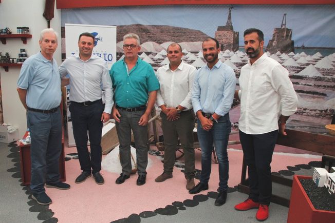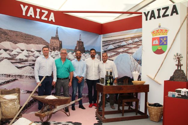 El alcalde de Yaiza, Óscar Noda, el primer teniente de alcalde, Ángel Domínguez, y los concejales Javier Camacho, Emilio Machín y Daniel Medina participaron del acto inaugural de la Feria y presentación del stand de Yaiza a las autoridades insulares al lado de Carlos Padrón, que forma parte de la tercera generación de propietarios de Janubio.
