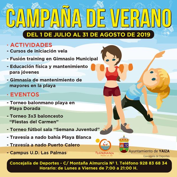 El Ayuntamiento de Yaiza abre su Campaña Deportiva de Verano ofreciendo diversidad de propuestas para que chicos y grandes disfruten practicando deporte e invirtiendo el tiempo de ocio en actividades saludables. Toda la información sobre actividades, disciplinas y pruebas deportivas de la Campaña puede consultarse en el banner de portada de la web municipal www.yaiza.es, donde aparece detallado (fechas, lugares y horarios) el programa del 1 de julio al 31 de agosto organizado por la Concejalía de Deportes de Yaiza.