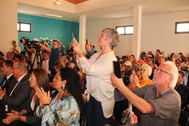 La presidenta del Cabildo de Lanzarote, María Dolores Corujo, el consejero de Cultura del Cabildo insular, Alberto Aguiar, concejales de ayuntamientos de la Isla y de la Corporación anfitriona, el cronista oficial de Yaiza, Esteban Rodríguez, descendientes de ‘El Salinero’, vecinos y vecinas de Las Breñas y de las Islas y miembros del equipo de producción del film ‘El Tiempo de la sal. Tras las huellas de Víctor Fernández Gopar’, participaron del acto que estuvo engalanado por la actuación poética - musical de los folkloristas Domingo y Antonio Corujo, Parranda Janubio y del grupo TriAkustic.