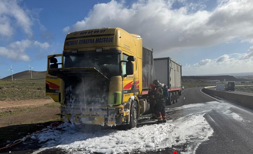 La cabina de un camión de gran tamaño ha ardido este miércoles por la mañana cuando circulaba por la carretera LZ-20, a unos tres kilómetros de Arrecife.