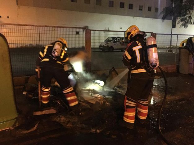 La primera alerta del 1-1-2 que recibieron los bomberos llegó sobre las 00:22 y avisaba del incendio de un contenedor de papel en la calle Elguinaguaira de Arrecife. Allí se encontraba la Policía Local. El incendio afectó a tres contenedores, uno de cartón, otro de vidrio y otro de plásticos. Los tres quedaron inservibles. Para su extinción, los bomberos utilizaron agua.