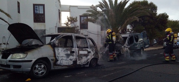 Los bomberos del Consorcio de Seguridad y Emergencias del Cabildo han tenido que actuar este sábado por la mañana para sofocar el incendio que se ha producido en dos vehículos que estaban estacionados en la calle La Orotava de Costa Teguise.