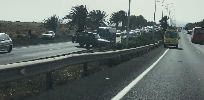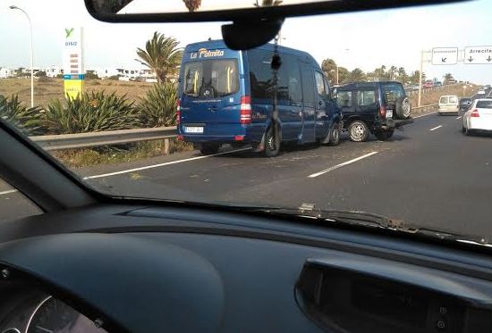 La colisión de dos vehículos ha colapsado este jueves por la tarde la autovía en dirección a Arrecife. Según la información facilitada por los servicios sanitarios que acudieron al lugar, no ha habido que lamentar daños personales y el choque se ha saldado sin heridos, en concreto, pasadas las 17:20 horas.