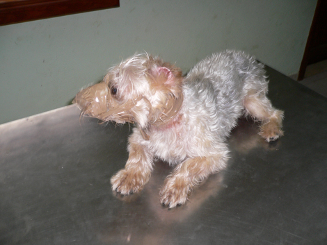 Cuando fue recogido, el can se encontraba en estado de shock, por lo que la primera actuación fue abrir un pequeño orificio en la cinta para que pudiera empezar a respirar.