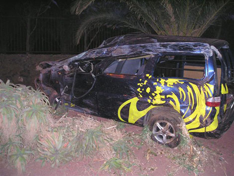 Este automóvil volcó tras salirse de la carretera. Los tres jóvenes no quisieron ser trasladados hasta el Hospital General de Lanzarote para someterse a una revisión clínica que alertara de posibles lesiones en sus