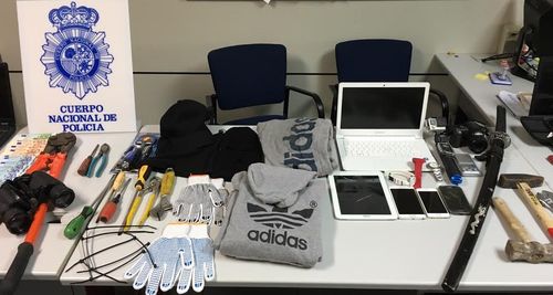 Tras la detenciones y en los seis registros domiciliarios realizados se han intervenido numerosas herramientas, un arma eléctrica tipo “Taser”, una catana, varios machetes, guantes, pasamontañas, relojes, tabletas, teléfonos móviles y más de 40 piezas de joyería. Además se incautaron la cantidad de 450 gramos de hachís, 5 gramos de metanfetamina “Cristal”, anabolizantes, cocaína y dinero en efectivo.