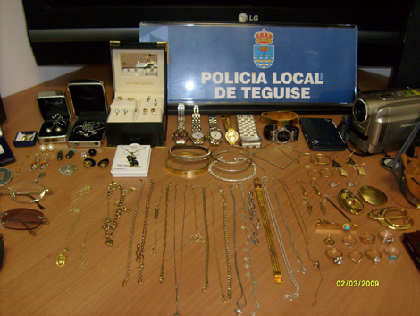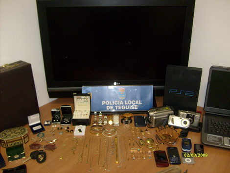 Añaden las fuentes que cuando se inspeccionó el interior del vehículo se encontró gran cantidad de objetos (televisión, ordenador portátil, joyas, ectétera), reconociendo uno de los detenidos que estos objetos habían sido sustraídos de una vivienda situada en Las Cabreras, término municipal de Teguise.