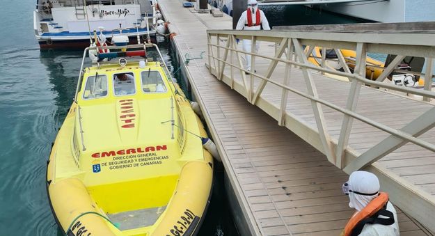 Los voluntarios de EMERLAN terminaron su servicio sobre las 15.30 horas, después de retirar los Equipos de Protección Individual (EPI) y llevar a cabo la desinfección del barco y de las barandillas del muelle de Órzola.
