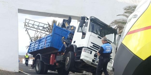 Un hombre de 40 años de edad ha resultado herido de carácter leve después de chocar con el camión que conducía con los arcos de entrada a la urbanización de Costa Teguise, según ha informado a este diario Emergencias y Rescates de Lanzarote (EMERLAN).