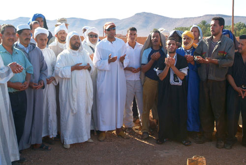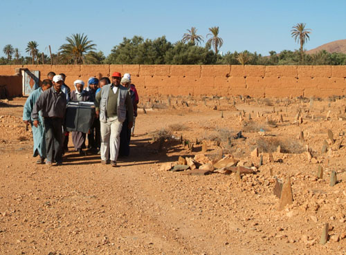 Cerca de una hora y media más tarde los féretros eran llevados al cementerio y acompañados por el cántico de que No hay nadie más grande que Dios y Mahoma es su profeta, pronunciado por los aproximadamente 150 asistentes, todos ellos hombres, que acudieron a despedirles. Los ataúdes se introdujeron de lado en la fosa, tal y como marca la tradición, y posteriormente fueron cubiertos con losas de pizarra y tierra de tonalidad rojiza, la misma del árido rincón del valle del Souss en el que se encuentra este pueblo de unos 14.000 habitantes.