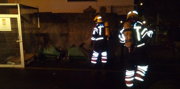 Según explican los bomberos, el primero de los incendios se produjo pasadas las tres de la madrugada en los contenedores que están en la calle Chimidas de San Bartolomé. Tres contenedores orgánicos que pasaron a mejor vida, y que finalmente quedaron totalmente calcinados.
