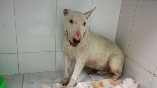 Personado la UPA-M, se valoró el estado del animal, se trata de una perra BullTerrier con signos de estar embarazada, bastante alterada y en estado de abandono.