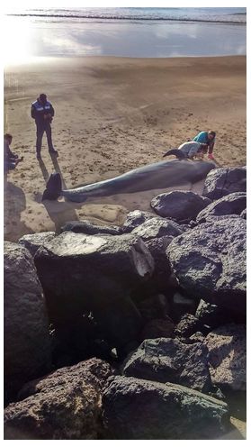 Agentes de la Policía Local de Tías fueron alertados en la tarde de este pasado viernes, 15 de diciembre, sobre la presencia de un cetáceo marino en la zona de playa próxima al aeropuerto de Lanzarote y Matagorda.