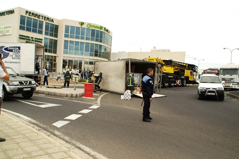También se personaron en el lugar los bomberos, que son siempre activados en accidentes con vuelcos de vehículos, aunque finalmente no tuvieron que excarcelar a ningún herido y se dedicaron a descargar las cajas que transportaba el camión, perteneciente a la compañía Darga Express, dedicada al reparto de mercancías entre islas.