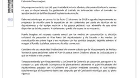 Ha dirigido un escrito al viceconsejero de Política Territorial del Gobierno de Canarias reprochando la "deslealtad institucional" con la que ha actuado al tomar decisiones sobre el Plan sin contar…