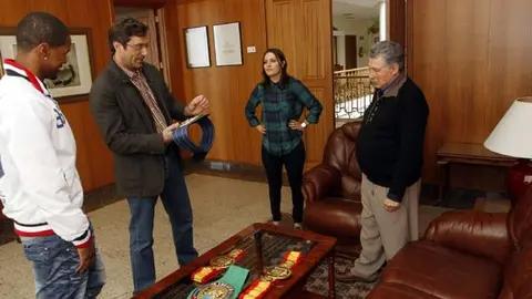 Acompañados por la consejera de Juventud y Deportes, Migdalia Machín, y por su entrenador, Palenque, San Ginés y el púgil lanzaroteño conversaron sobre el combate que venció en París