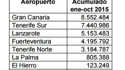 Los aeropuertos canarios registran el mejor octubre de su historia con 3.225.897 pasajeros, un 5,9% más que en el mismo periodo de 2014