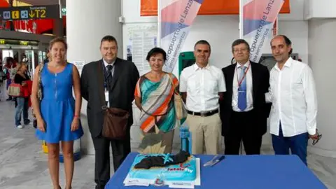 El consejero delegado de Turismo Lanzarote, Héctor Fernández, el director del aeropuerto lanzaroteño, Manuel Vinagre, y la delegada de TUI en Lanzarote, Carmen Batista, fueron los responsables de dar la bienvenida a los ocupantes del vuelo