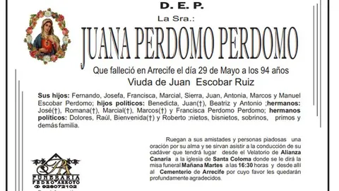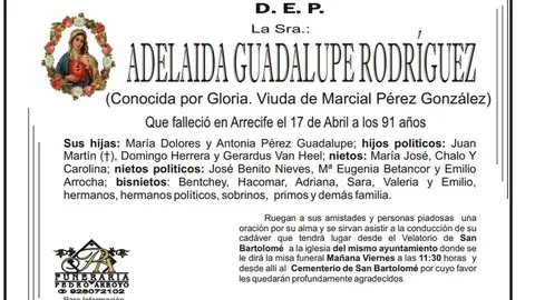 Que falleció en Arrecife el 17 de Abril a los 91 años D.E.P. Adelaida Guadalupe Rodríguez Crónicas 18/4/24