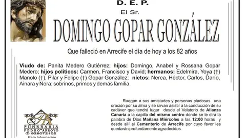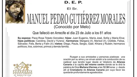 Que falleció en Arrecife a los 81 años de edad D.E.P. Manuel Pedro Gutiérrez Morales Crónicas 25/7/24