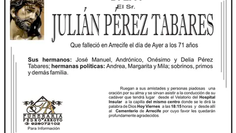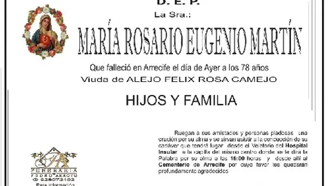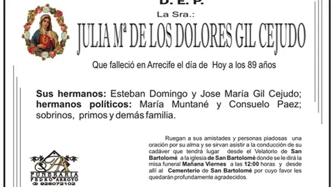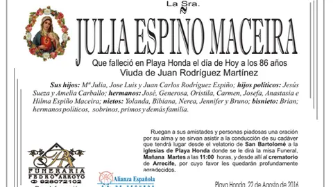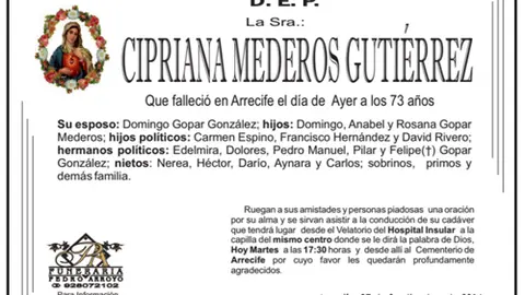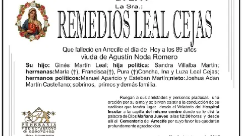 D.E.P. Remedios Leal Cejas 1/3/17 Falleció el 1 de marzo de 2017 a los 89 años, viuda de Agustín Noda Romero