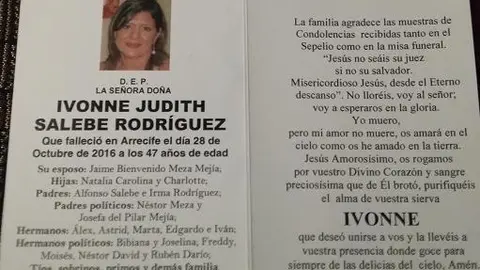La Misa Funeral tendrá lugar este viernes, 4 de noviembre, a las 18 horas, en la Iglesia de Playa Blanca, en Yaiza D. E. P. Ivonne Judith Salebe Rodríguez Crónicas 29/10/16 Falleció en Arrecife el 28 de Octubre de 2016 a los 47 años