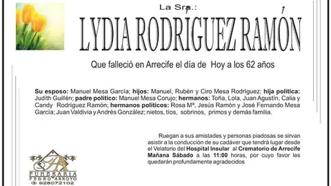 D.E.P. Lydia Rodríguez Ramón Crónicas 8/3/19 Quwe falleció en Arrecife este viernes, 8 de marzo de 2019, a los 62 años de edad