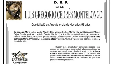 D.E.P. Luis Gregorio Cedrés Montelongo Crónicas 29/3/19 Que falleció en Arrecife este viernes, 29 de marzo de 2019, a los 58 años de edad
