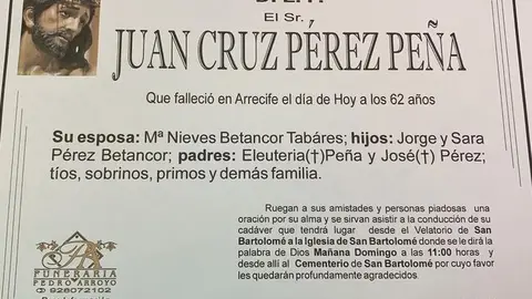 D.E.P. Juan Cruz Pérez Peña Crónicas 20/4/19 Que falleció en Arrecife este sábado a los 62 años de edad