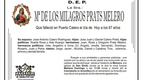 D.E.P. María de los Milagros Prats Melero Crónicas 20/4/19 Que falleció este sábado en Puerto Calero a los 67 años de edad