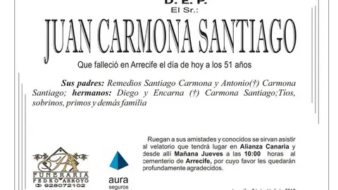 D.E.P. Juan Carmona Santiago Crónicas 24/4/19 Que falleció este miércoles en Arrecife a los 51 años de edad