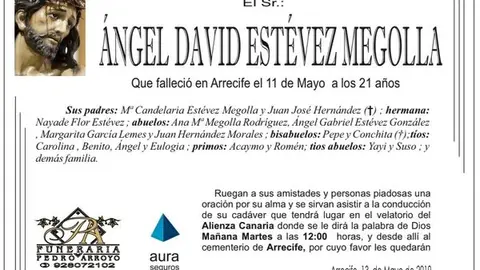 D.E.P. Ángel David Estévez Megolla Crónicas 13/5/19 Que falleció en Arrecife el 11 de mayo de 2019 a los 21 años de edad