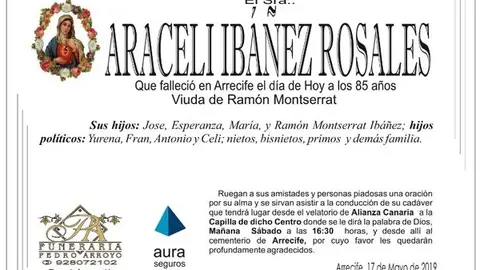 D.E.P. Araceli Ibáñez Rosales Crónicas 17/5/19 Que falleció en Arrecife este viernes, 17 de mayo de 2019, a los 85 años de edad. Viuda de Ramón Monserrat