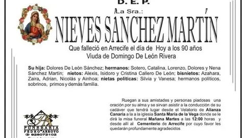 D.E.P. Nieves Sánchez Martín Crónicas 20/5/19 Que falleció en Arrecife este lunes, 20 de mayo de 2019. Viuda de Domingo de León Rivera