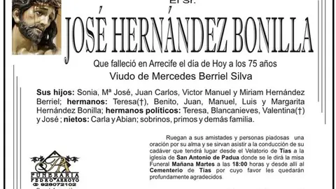 D.E.P. José Hernández Bonilla Crónicas 25/6/19 Que falleció en Arrecife este lunes, 24 de junio de 2019, a los 75 años. Viudo de Mercedes Berriel Silva
