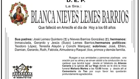D.E.P. Blanca Nieves Lemes Barrios Crónicas 26/8/19 Que falleció en Arrecife este lunes, 26 de agosto de 2019, a los 68 años de edad